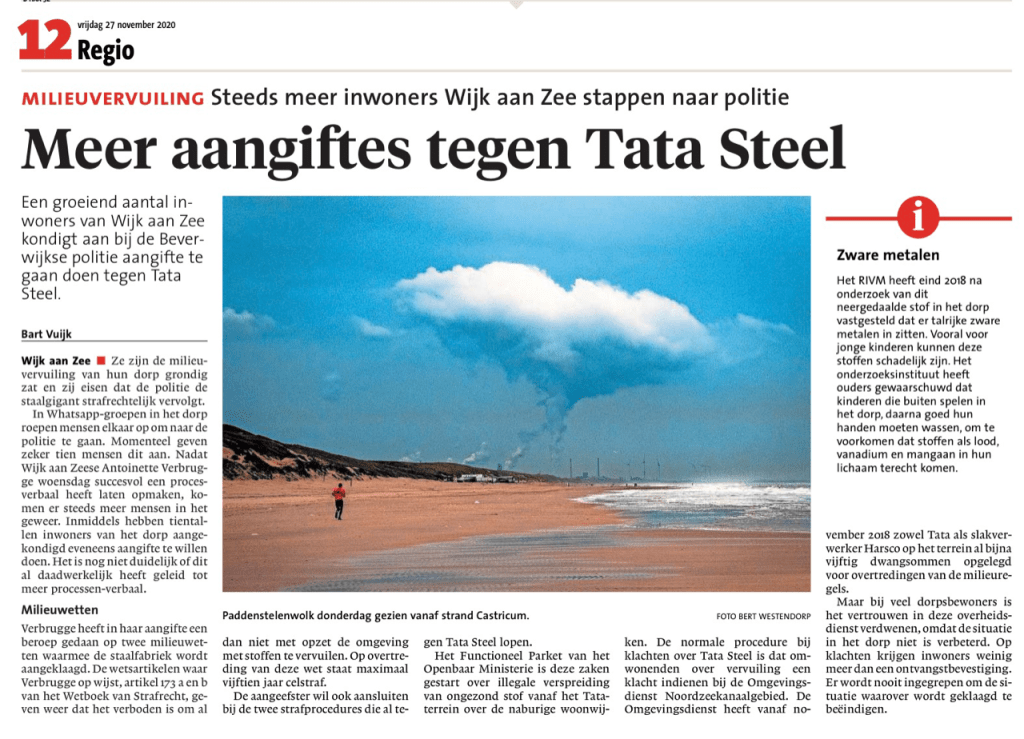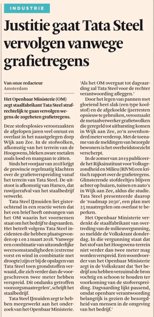 Die indruk is ontstaan in Velsen waar Tata Steel (de oude hoogovens) voortdurend milieuovertredingen begaat, waaronder grafiet en lood uitstoot, die de omwonende inademen. Veel inwoners maken zich begrijpelijk grote zorgen over het effect van stof op hun gezondheid. Er was anderhalf tot twee keer meer uitstootten dan toegestaan. De provincie is het bevoegde orgaan om te handhaven om de milieuovertredingen te beëindigen. De provincie besloot een last onder dwangsom op te leggen van EUR 10.000 per overtreding. Een lachertje natuurlijk voor een miljardenconcern. De overtreding gingen gewoon door; de lokale bevolking bleef het slachtoffers van de grafietregens. De stikstofuitstoot is een bedreiging voor de duingebieden